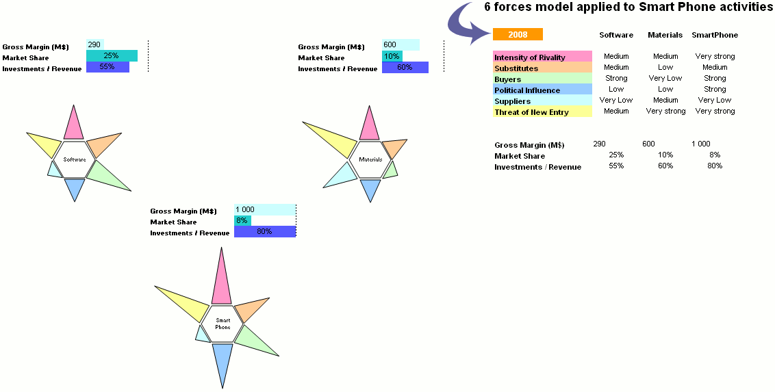 Once you have chosen you data visualization(*), you can optimze it the way you want. Here is a vector glyph / star glyph showing Michael E. Porter's five forces model. In fact here this visual representation is the updated model, showing a sixth force created by Brandenburger and Nalebuff (used by Intel and Microsoft). With BeGraphic, you can mix different types of data visualisations to get the most appropriate representation for each information you analyse.