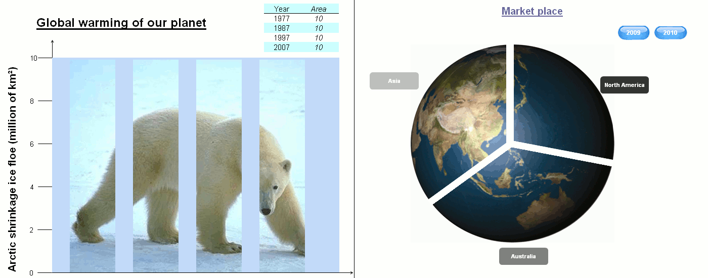 Because data visualization is more powerful with meaningful images (rather than the over-used pie chart), BeGraphic handles the parameters of your specific picture as if it was an Excel chart. BeGraphic allows you to change the color, border of any object shown on Microsoft Excel or PowerPoint. But it can also move or make disappear your specific logos and icons on any background (e.g.: custom map, podium showing best products).