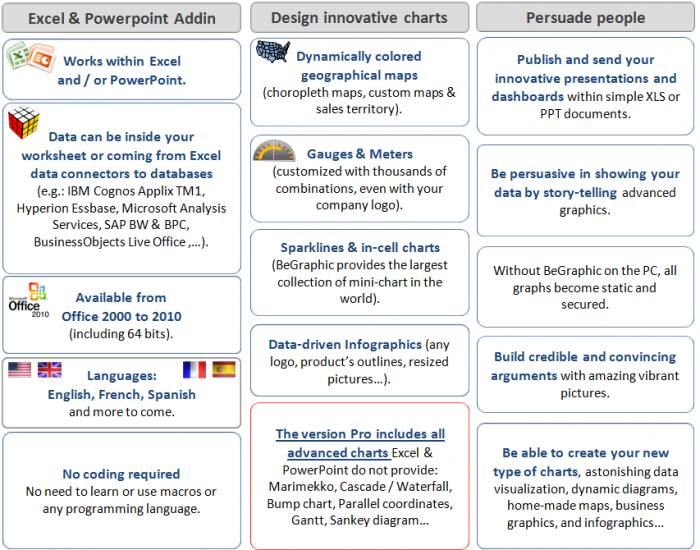 Design innovative charts : dynamically colored geographical maps (choropleth maps, custom maps & sales territory). Gauges & meters (customized with thousands of combinations, even with your company logo). Sparklines & in-cell charts (BeGraphic provides the largest collection of mini-chart in the world). Data-driven infographics (any logo, product's outlines, resized pictured...). The version Pro includes all advanced charts Excel & PowerPoint do not provide: Marimekko, Cascade / Waterfall, BumpChart, Parallel coordinates, Gantt, Sanley diagram...
